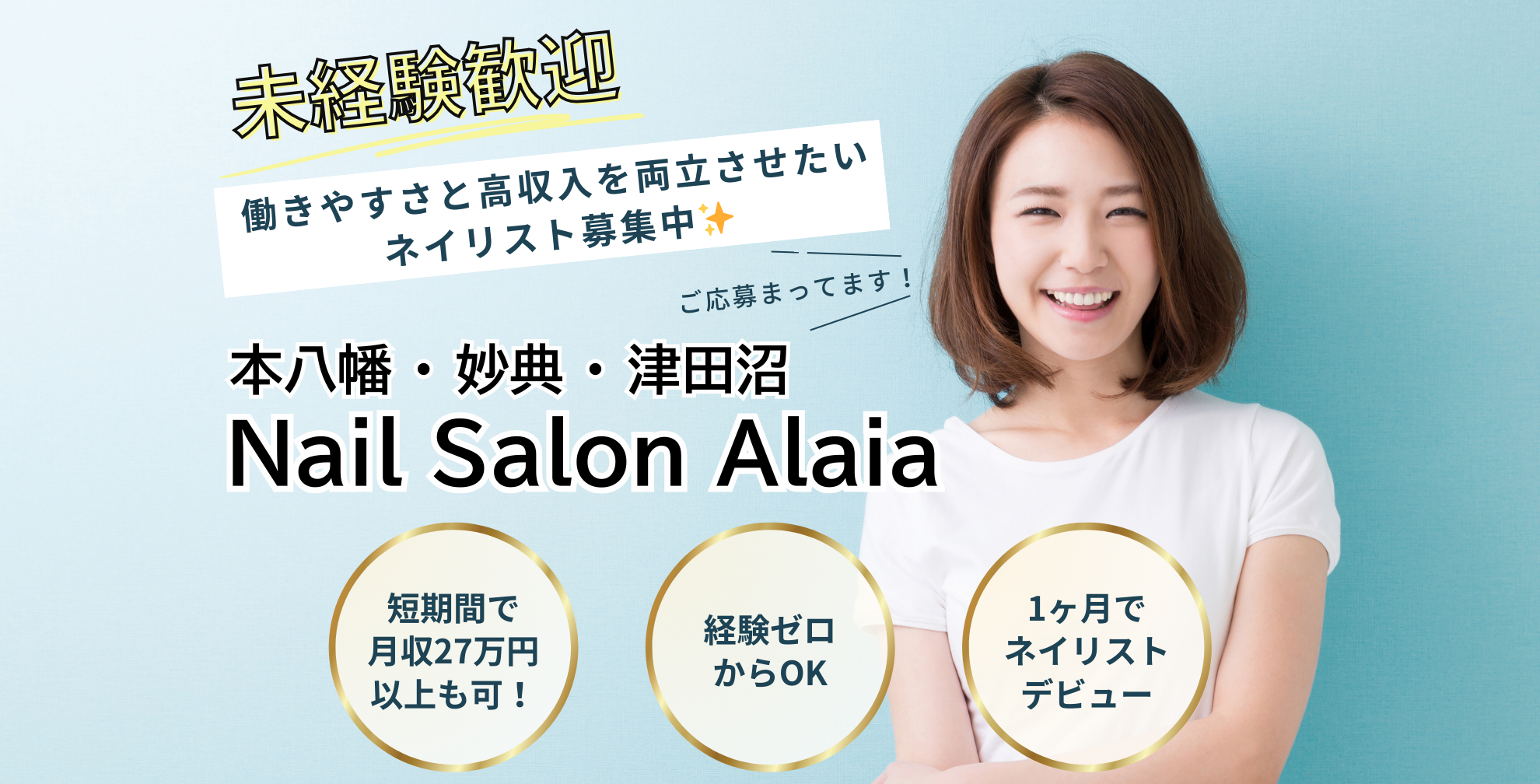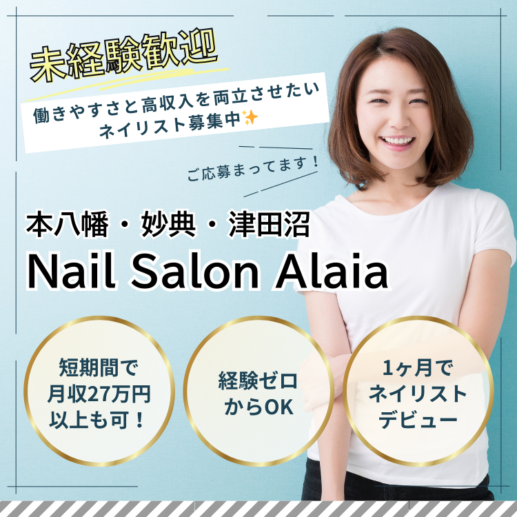 ネイルサロン「Alaia」は、長く通っていただいているお客様が多い、地域で信頼されるサロンです。